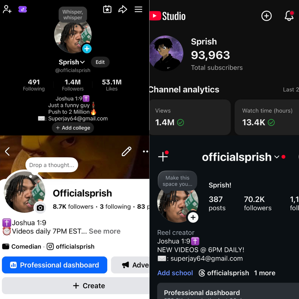 Over the past nine years, I have created and produced original comedy sketches online, building an audience of over 1.6 million followers across platforms under the brand @OfficialSprish. Through this work, I have collaborated with and promoted major brands including Sony Entertainment, Amazon, and Subway.